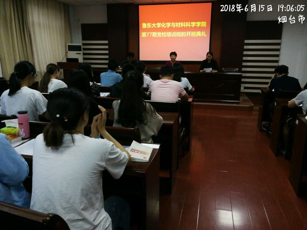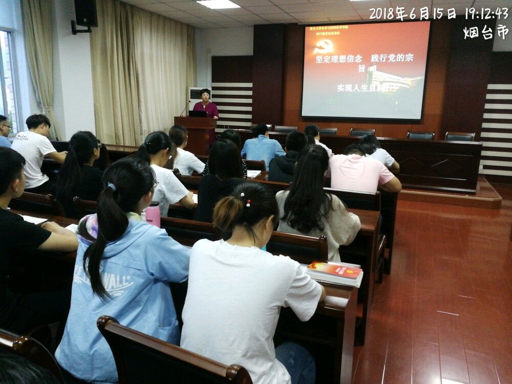 6月15日晚,必赢76net线路在生化大楼A307举行第77期党校培训班开班典礼,典礼结束后党总支副书记于兆玲为全体入党积极分子和党员上了《坚定理想信念 践行党的宗旨 实现人生目标》党课。