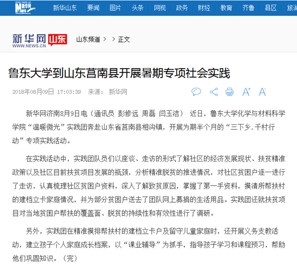 近日,新华网山东频道、临沂文明网以《鲁东大学到山东莒南县开展暑期专项社会实践》为题报道了必赢76net线路“千村行动”专项社会实践活动。