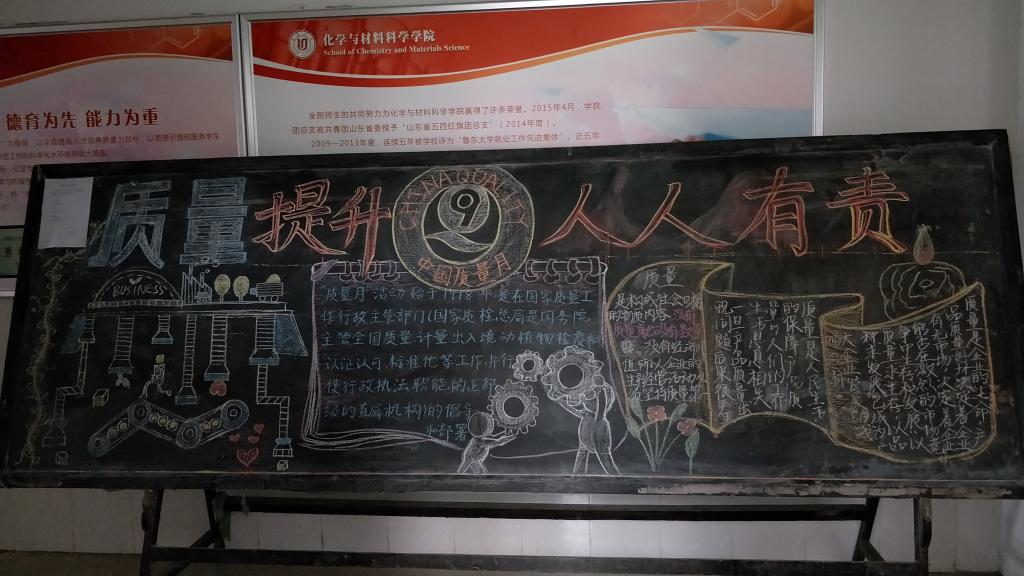9月18日,为响应山东省教育厅《山东省质量强省及品牌战略推进工作领导小组关于开展2018年全省“质量月”活动的通知》,必赢76net线路积极组织开展了“质量月”绘画黑板报活动。