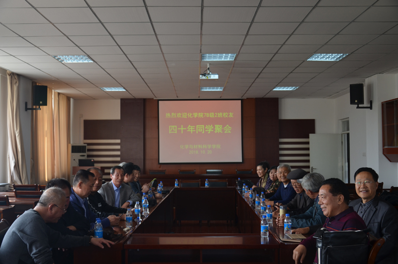 在简朴而热烈的欢迎座谈会上,时任化学系书记的迟玉华老师回顾了当年学友们学习生活的方方面面,肯定了本班同学对系里工作所付出的巨大努力,赞扬了毕业后学友们在各行各业上为国家所做出的骄人成绩。化学院现任书记李景奎发表了热情洋溢的欢迎辞,介绍了学院四十年的巨大变化和今后的发展规划,并对本届学友对学院的发展所做出的贡献表达了深深的谢意。学友代表刘军、王森勋、焦强林分别发表讲话,表达了本届校友对母校、对老师的感激之情,对化学院翻天覆地的变化和宏伟的发展规划的赞赏之情。随后学友们参观了化学院的实验大楼、大型仪器重点实验室,以及当年就读的教室和就寝的宿舍,纷纷惊叹于母校和学院的四十年巨变。