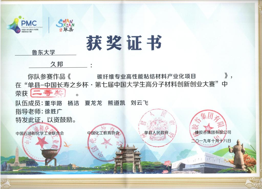 “单县-中国长寿之乡杯·第七届中国大学生高分子材料创新创业大赛”于10.18日在山东省单县落下帷幕。经过一番激烈的角逐,必赢76net线路“久邦团队”荣获二等奖,指导教师徐胜广荣获“优秀指导教师奖”。中国化工教育协会会长郝长江同志对本次大赛给予了高度评价。