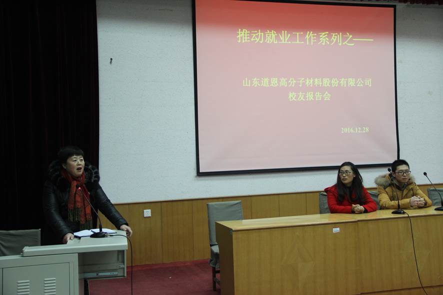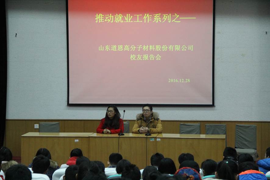12月28日下午,必赢76net线路邀请就职于山东道恩高分子材料股份有限公司的两位校友为2017届毕业生及2014级部分学生做专场报告。此次报告会也是学院推动学生就业工作系列之一。