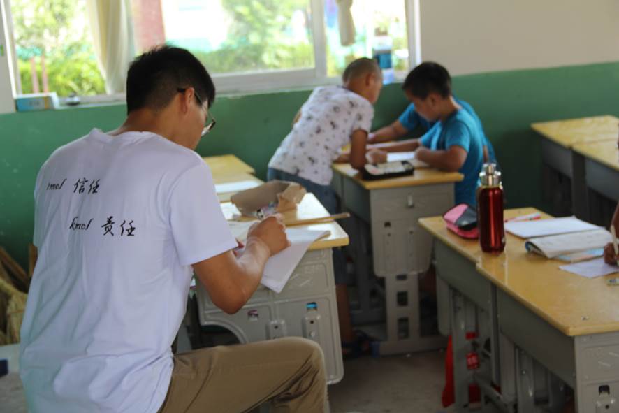 那一个个高举的小手,那一双双明亮的眼眸,教室里回荡着朗朗诵读声,数学课上激烈的抢答,英语课上积极的重复单词,燥热的酷暑依旧抵挡不住同学们高涨的求知欲,实践团队在晨读中开始了第四天的支教活动。数学课上周春杨队员开始为同学们讲解比较大小,生动形象的教学方法使同学们欣然掌握所学内容。刘泽华队员带领同学们一起学习新的英语单词,巧妙运用教室里的桌椅与教材结合,言简意赅地使同学们热爱上这门外语。支教活动不知不觉过去了一半的时间,团队队员为鼓励同学们这段期间的学习积极性,奖励每一位同学一本笔记本,寓教于乐,同学们脸上洋溢的笑容是支教团队最大的收获。