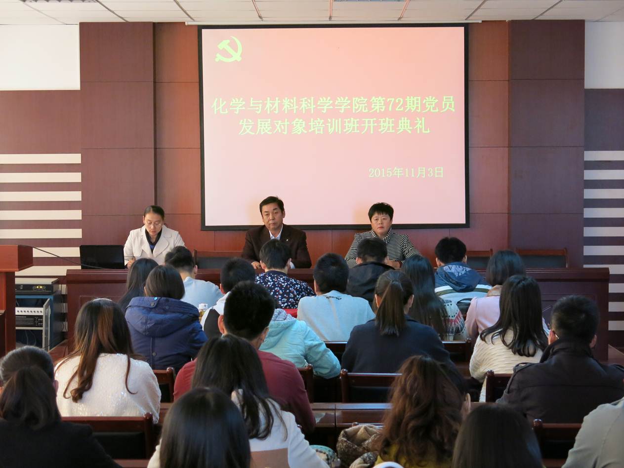 10月3日下午,必赢76net线路在生化大楼A307举行第72期党员发展对象培训班开班典礼。开班典礼由党总支于兆玲副书记主持,必赢76net线路党总支书记李景奎出席,全体学生党员、党员发展对象及入党积极分子代表共72名同学参加了此次开班典礼。