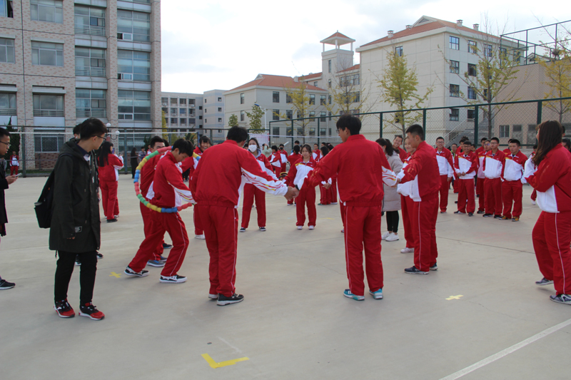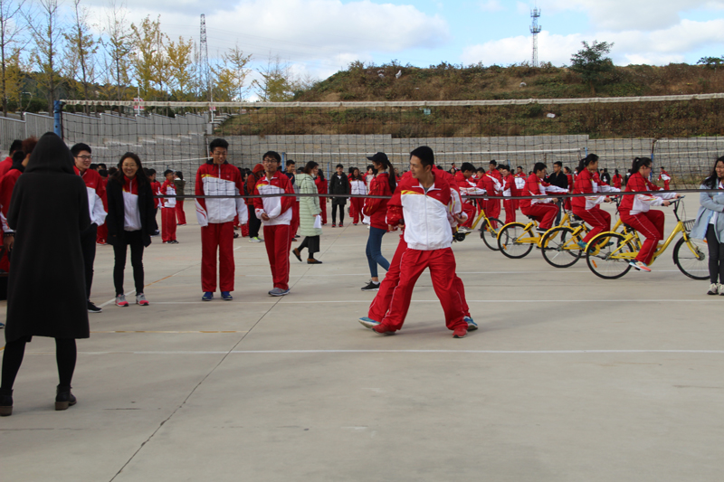 午后的阳光似乎是在和我们躲迷藏,一会出现,一会消失,唯有刺骨寒风狂啸不停,即使天气现状如此惨淡,学生会的同学们依旧提前来到排球场布置比赛场地。下午2时许,17级同学们在各班负责人的带领下来到比赛场地集合,按班级在各个比赛项目前排好次序。此次趣味运动会包含为沙包三分大赛、勇往直前、小黄车慢骑、穿越火线、天马行空五个项目。光听这新颖独特的项目名称有点摸不着头脑。勇往直前是单脚跳通过25米、蛙跳通过25米、乒乓球拍托乒乓球跑通过25米、背对背夹着气球通过25米接力跑。穿越火线则是手拉手绕成一圈,利用身体的摆动传递呼啦圈。天马行空竟是接力跳绳。新颖的游戏引发了同学们极大的兴趣,虽然风不见止,但是同学们参与游戏的热情也依旧高涨。趣味运动会结束,同学们带着满脸欢笑离开排球场。
